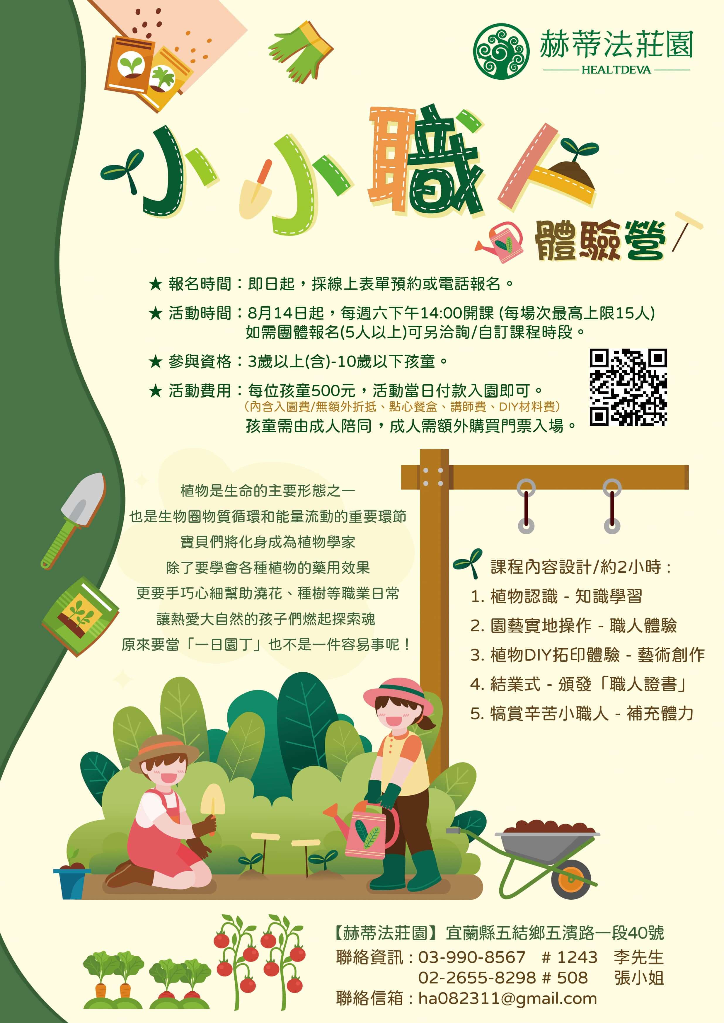 執行方向:寶貝們將成為植物學家,除了要學會各種植物的藥用效果,更要手巧心細幫助澆花、種樹等職業日常,讓熱愛大自然的孩子們燃起探索魂,原來要當「一日園丁」也不是一件容易事呢!另外也會在莊園採集材料並創作藝術作品,製作獨一無二的植物拓印。一日職人體驗完成後,莊園將頒發「認證證書」作為對小職人的肯定